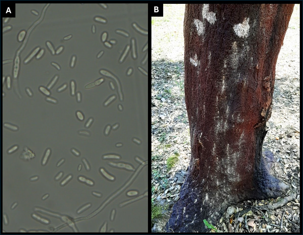 | Figura 1. A: Espores de D. corticola vistes al microscopi. B: Tronc d’alzina surera amb serradures causades per l’entrada de P. cylindrus |