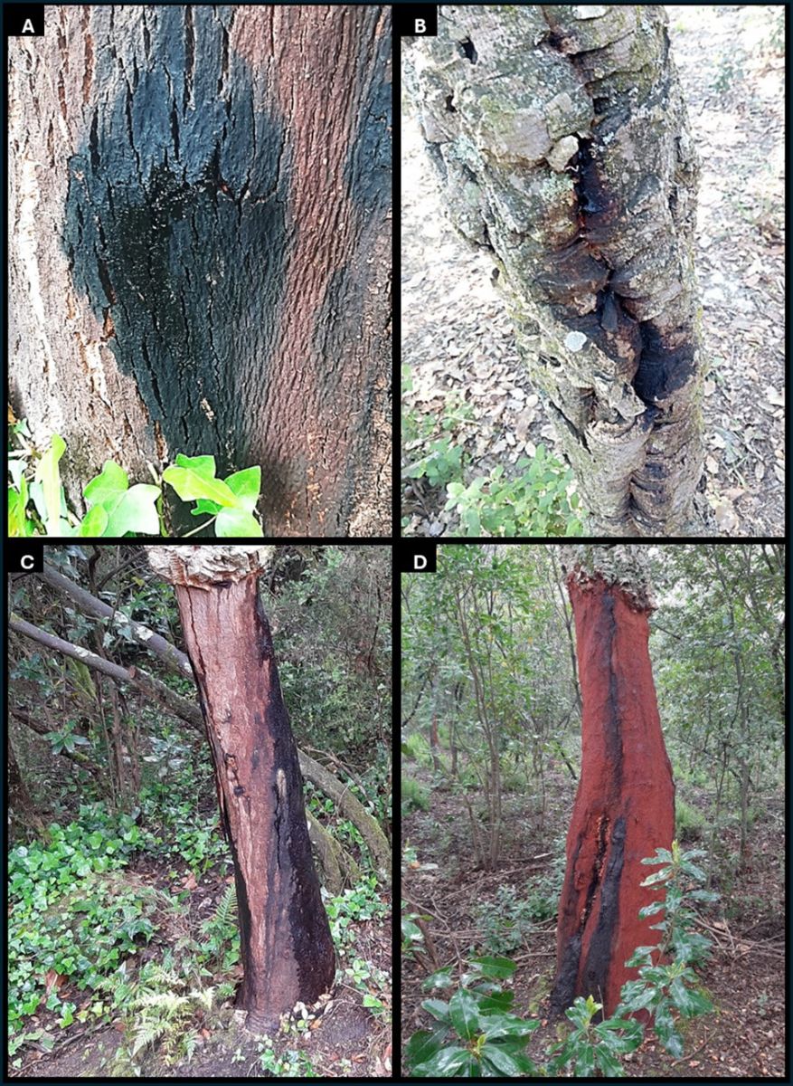 Figura 1. A: Fotografies de l’Escaldat del Suro. A: Xancre de D. corticola a l’escorça d’un suro pelat anteriorment. B: Xancre de D. corticola en un suro pelagrí. C i D: Troncs pelats amb xancres que presenten exsudacions abundants.