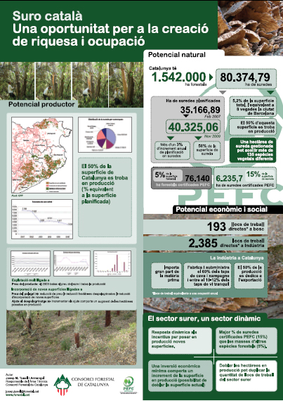 Pòster elaborat per Josep M. Tusell, responsable de l'Àrea Tècnica del Consorci Forestal de Catalunya, en què s'analitza el potencial natural, productor, econòmic i social del sector surer català. Pòster presentat en el marc de la primera trobada d'espais naturals surers a Palafrugell.